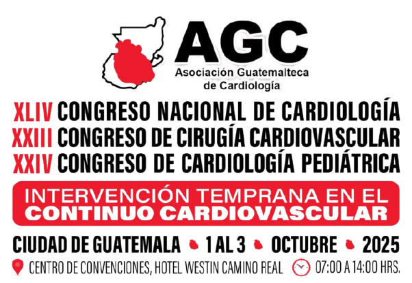 La Asociación Guatemalteca de Cardiología (AGC) te invita a participar en el evento médico más importante del año: XLIV Congreso Nacional de Cardiología, XXIII Congreso de Cirugía Cardiovascular y XXIV Congreso de Cardiología Pediátrica, bajo el lema: 🫀 "Intervención temprana en el continuo cardiovascular" Durante tres días, destacados especialistas nacionales e internacionales compartirán los últimos avances en prevención, diagnóstico y tratamiento de enfermedades cardiovasculares. El evento se llevará a cabo en el Centro de Convenciones del Hotel Westin Camino Real, en un entorno de alto nivel académico y networking